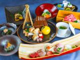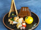 ・旬菜 | 稚鮎春巻き/クラゲ/あわびと白木耳真砂和え/海老汐煮 グリンピースチーズ/鯛小袖寿司/赤蒟蒻/花びら百合根/あいがも/蕗伽羅煮 |